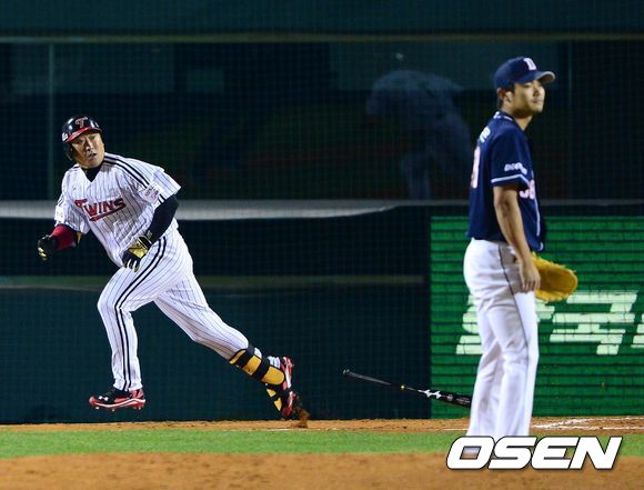 16일 오후 잠실구장에서 열린 '2013 한국야쿠르트 세븐 프로야구' LG 트윈스와 두산 베어스의 플레이오프 1차전, 1회말 무사 1루에서 LG 이병규가 좌월 투런 홈런을 치고 덕아웃에서 있다.