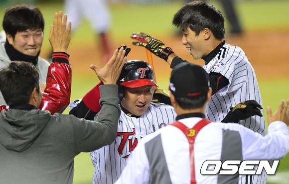 16일 오후 잠실구장에서 열린 '2013 한국야쿠르트 세븐 프로야구' LG 트윈스와 두산 베어스의 플레이오프 1차전, 1회말 LG 공격 무사 1루 상황 2번 이병규(7번)이 동점 좌월 투런포를 날리고 더그아웃 동료들의 축하를 받고 있다.