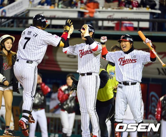 16일 오후 잠실구장에서 열린 '2013 한국야쿠르트 세븐 프로야구' LG 트윈스와 두산 베어스의 플레이오프 1차전, 1회말 무사 1루 이병규가 동점 투런 홈런을 치고 동료들의 환영을 받고 있다.