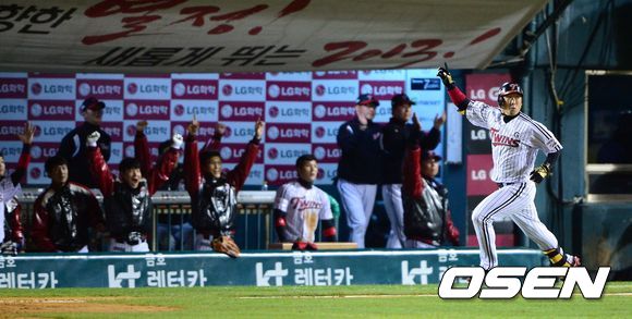 16일 오후 잠실구장에서 열린 '2013 한국야쿠르트 세븐 프로야구' LG 트윈스와 두산 베어스의 플레이오프 1차전, 1회말 무사 1루에서 LG 이병규가 좌월 투런 홈런을 치고 환호하고 있다.
