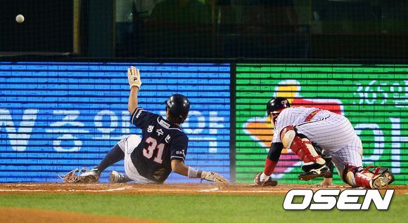 16일 오후 잠실구장에서 열린 '2013 한국야쿠르트 세븐 프로야구' LG 트윈스와 두산 베어스의 플레이오프 1차전, 1회초 무사 1,3루에서 두산 최준석의 내야땅볼 때 LG 정성훈의 송구 실책으로 3루주자 정수빈이 홈에서 세이프 되고 있다.
