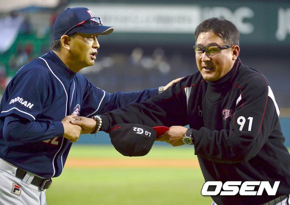 16일 오후 잠실구장에서 열린 '2013 한국야쿠르트 세븐 프로야구' LG 트윈스와 두산 베어스의 플레이오프 1차전, 경기 전 김진욱 김기태 감독이 악수를 나누고 있다.