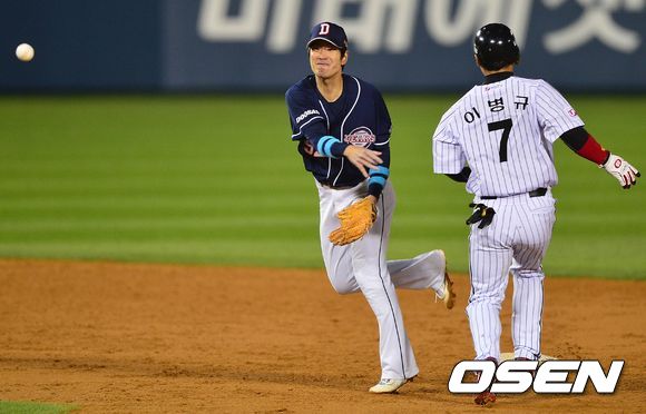 16일 오후 잠실구장에서 열린 '2013 한국야쿠르트 세븐 프로야구' LG 트윈스와 두산 베어스의 플레이오프 1차전, 3회말 LG공격 1사 1, 2루 상황 이진영의 내야 땅볼 때 두산 유격수 김재호가 주자 이병규를 포스아웃 시킨 뒤 1루로 송구하고 있다.