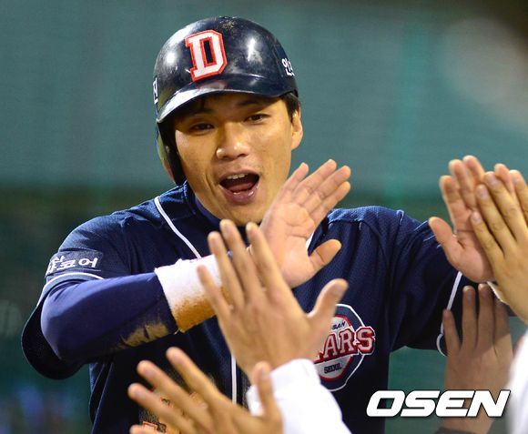 16일 오후 잠실구장에서 열린 '2013 한국야쿠르트 세븐 프로야구' LG 트윈스와 두산 베어스의 플레이오프 1차전, 1회초 무사 1,3루 김현수의 적시타때 홈을 밟은 이종욱이 동료들의 환영을 받고 있다.