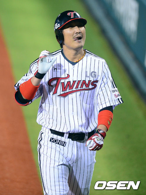 16일 오후 잠실구장에서 열린 '2013 한국야쿠르트 세븐 프로야구' LG 트윈스와 두산 베어스의 플레이오프 1차전, 3회말 무사 1,2루에서 LG 이진영이 병살타로 물러나며 아쉬워하고 있다.