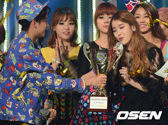 16일 오후 서울 마포구 상암동 누리꿈 스퀘어에서 진행된 MBC MUSIC '쇼 챔피언'에서 1위를 차지한 아이유가 1위 트로피를 받고 있다.