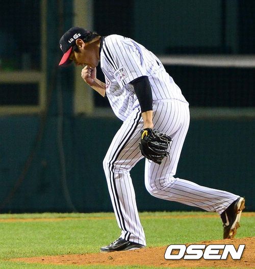 16일 오후 잠실구장에서 열린 '2013 한국야쿠르트 세븐 프로야구' LG 트윈스와 두산 베어스의 플레이오프 1차전, 5회초 2사 1,2루에서 LG 류제국이 두산 홍성흔은 삼진으로 처리하고 환호하고 있다.