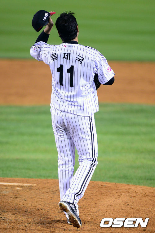 16일 오후 잠실구장에서 열린 '2013 한국야쿠르트 세븐 프로야구' LG 트윈스와 두산 베어스의 플레이오프 1차전, 5회초 LG 류제국이 2사 1,2루의 위기를 맞으며 모자를 고쳐쓰고 있다.