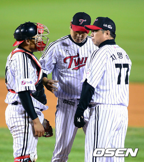 16일 오후 잠실구장에서 열린 '2013 한국야쿠르트 세븐 프로야구' LG 트윈스와 두산 베어스의 플레이오프 1차전, 6회초 1사 1,3루에서 LG 류제국이 강판당하고 있다.