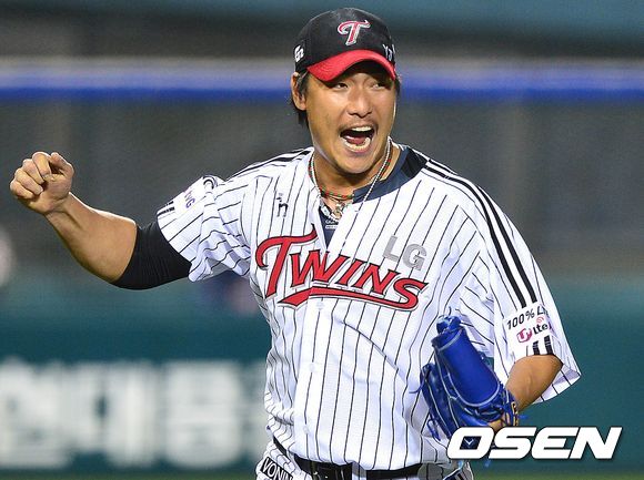 16일 오후 잠실구장에서 열린 '2013 한국야쿠르트 세븐 프로야구' LG 트윈스와 두산 베어스의 플레이오프 1차전, 6회초 두산 공격 1사 1, 3루 상황 9번 김재호를 2루수 직선타로 이끌며 1루 주자까지 잡아내며 이닝을 막아낸 LG 투수 이동현이 환호하고 있다.