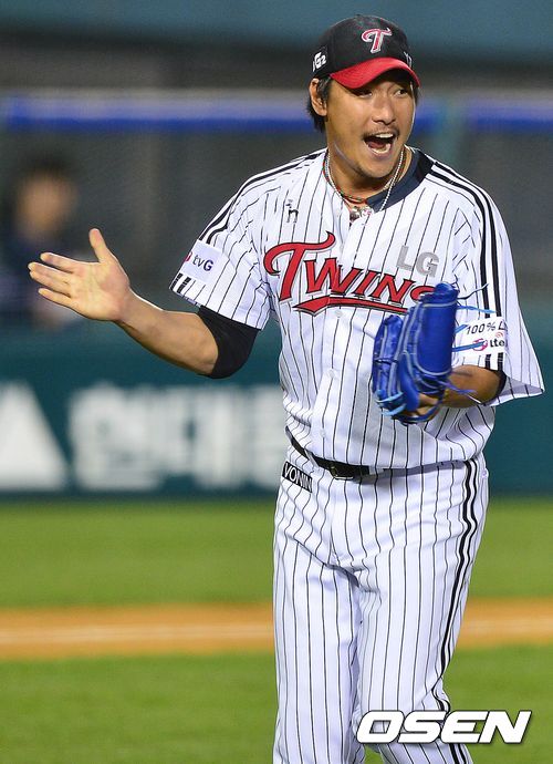 16일 오후 잠실구장에서 열린 '2013 한국야쿠르트 세븐 프로야구' LG 트윈스와 두산 베어스의 플레이오프 1차전, 6회초 두산 공격 1사 1, 3루 상황 9번 김재호를 2루수 직선타로 이끌며 1루 주자까지 잡아내며 이닝을 막아낸 LG 투수 이동현이 환호하고 있다.