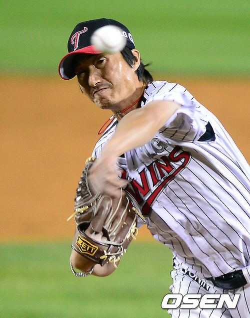 16일 오후 잠실구장에서 열린 '2013 한국야쿠르트 세븐 프로야구' LG 트윈스와 두산 베어스의 플레이오프 1차전, 7회초 1사 2루에서 LG 이상열이 두산 김현수를 상대하고 있다.