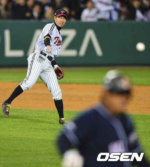16일 오후 잠실구장에서 열린 '2013 한국야쿠르트 세븐 프로야구' LG 트윈스와 두산 베어스의 플레이오프 1차전, 7회초 두산 공격 2사 3루 상황 4번 최준석의 내야 땅볼 타구를 LG 3루수 정성훈이 더듬은 뒤 1루로 송구하고 있다. 이 틈을 틈타 타자주자 최준석은 1루에 세이프, 3루주자는 홈을 밟으며 역전득점을 올렸다.
