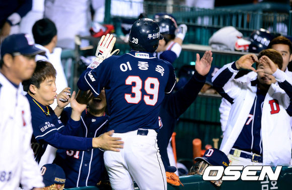 16일 오후 잠실구장에서 열린 '2013 한국야쿠르트 세븐 프로야구' LG 트윈스와 두산 베어스의 플레이오프 1차전, 7회초 2사 3루에서 두산 최준석의 3루수 땅볼 타구를 LG 정성훈이 실책하며 3루주자 이종욱이 홈을 밟고 더그아웃에서 동료선수들과 하이파이브를 하고 있다.