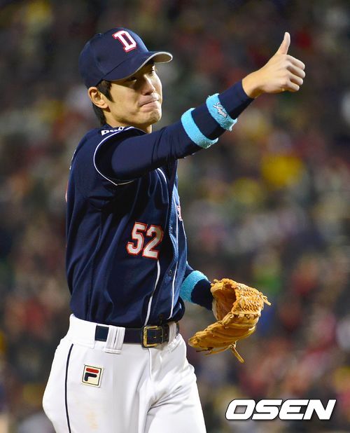 16일 오후 잠실구장에서 열린 '2013 한국야쿠르트 세븐 프로야구' LG 트윈스와 두산 베어스의 플레이오프 1차전, 7회말 1사 1루 손주인의 타구를 병살로 연결시킨 김재호가 엄지손가락을 들어보이고 있다.