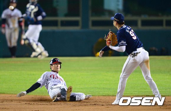 16일 오후 잠실구장에서 열린 '2013 한국야쿠르트 세븐 프로야구' LG 트윈스와 두산 베어스의 플레이오프 1차전, 7회말 1사 1루에서 LG 손주인의 병살타 때 1루주자 문선재가 포스아웃 처리되고 있다.