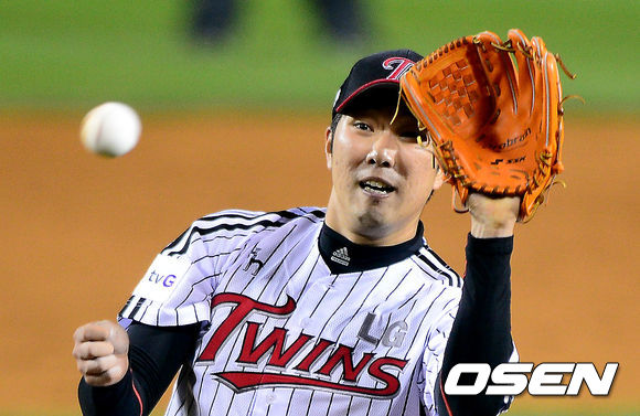 16일 오후 잠실구장에서 열린 '2013 한국야쿠르트 세븐 프로야구' LG 트윈스와 두산 베어스의 플레이오프 1차전, 8회초 2사에서 LG 유원상이 두산 최재훈의 타구를 처리하고 있다.