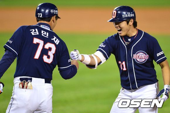 16일 오후 잠실구장에서 열린 '2013 한국야쿠르트 세븐 프로야구' LG 트윈스와 두산 베어스의 플레이오프 1차전, 9회초 두산 공격 1사 2루 상황 2번 정수빈이 1타점 중전안타를 날리고 김민재 코치와 인사를 나누고 있다.