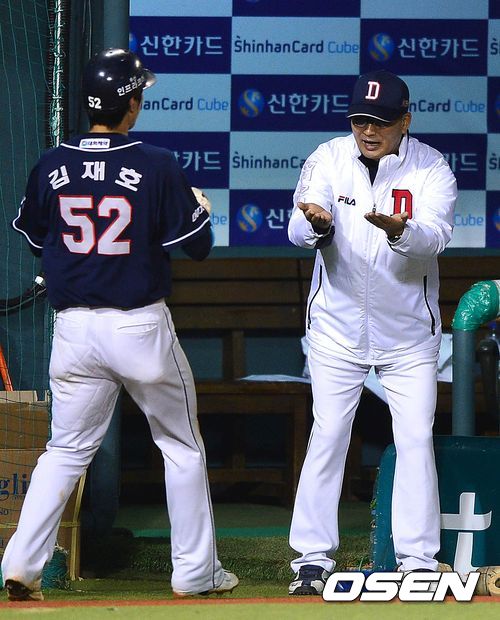 16일 오후 잠실구장에서 열린 '2013 한국야쿠르트 세븐 프로야구' LG 트윈스와 두산 베어스의 플레이오프 1차전, 9회초 두산 공격 1사 2루 상황 2번 정수빈의 1타점 중전안타로 득점에 성공한 김재호가 김진욱 감독과 인사를 나누고 있다.