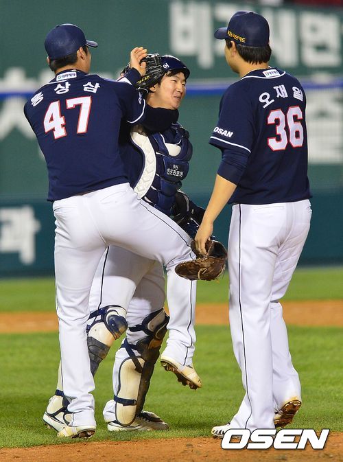 경기를 매조지한 두산 투수 홍상삼과 포수 최재훈이 장난스럽게 인사를 나누고 있다./dreamer@osen.co.kr