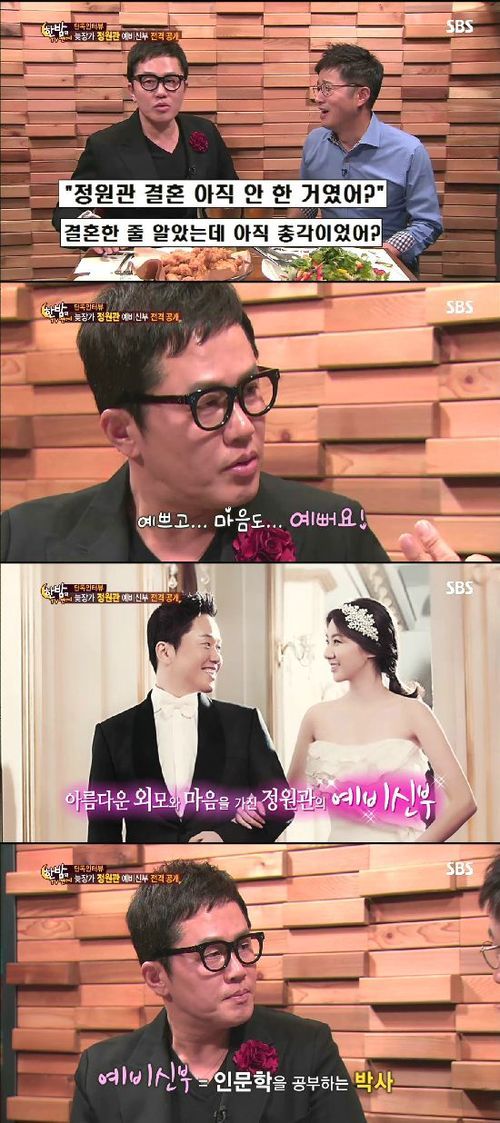 정원관은 16일 방송된 SBS ‘한밤의 TV연예’와의 인터뷰에서 “결혼한다니까 몇 번째 결혼이냐고 묻는 분들이 많으시다”면서 “첫 결혼이다.(웃음) 그동안 결혼이라는 걸 잊어버리고 살았던 거 같다. 이 친구 만나기 전에는 당연히 혼자 사는 건 줄 알고 살았다”고 결혼을 앞둔 들뜬 감정을 표현했다.