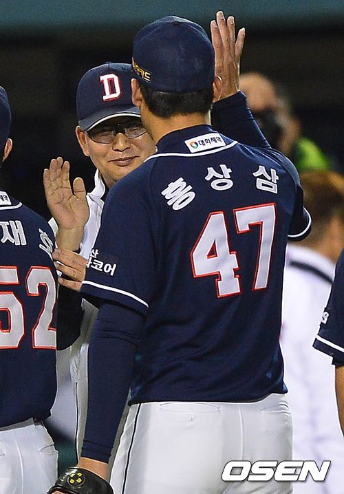 두산 김진욱 감독이 홍상삼과 인사를 나누고 있다./dreamer@osen.co.kr