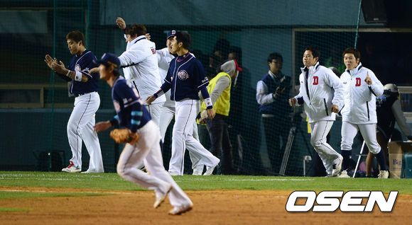 환호하는 두산,'이대로 쭉 한국시리즈까지!'