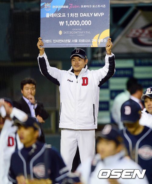 플레이오프 1차전 MVP를 차지한 두산 노경은이 기념촬영을 하고 있다./dreamer@osen.co.kr