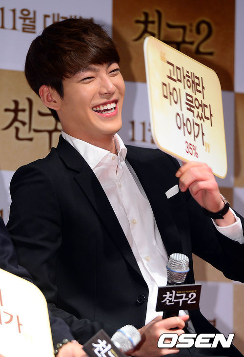 17일 오전 서울 자양동 롯데시네마 건대입구에서 열린 영화 '친구2' 제작보고회에서 김우빈이 유행어 대사를 말하고 웃음을 터트리고 있다.