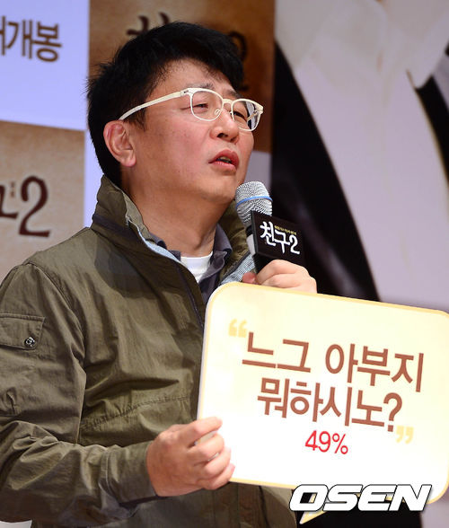 17일 오전 서울 자양동 롯데시네마 건대입구에서 열린 영화 '친구2' 제작보고회에서 곽경택 감독이 유행어 대사를 말하고 있다.