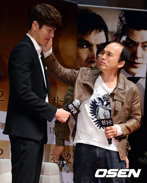17일 오전 서울 자양동 롯데시네마 건대입구에서 열린 영화 '친구2' 제작보고회에서 김광규가 김우빈에게 유행어 대사를 말하고 있다.
