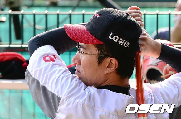 17일 오후 잠실구장에서 열린 '2013 한국야쿠르트 세븐 프로야구' LG 트윈스와 두산 베어스의 플레이오프 2차전, 경기에 앞서 LG 정성훈이 덕아웃에서 배트를 휘두르고 있다.