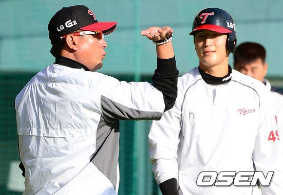 17일 오후 잠실구장에서 열린 '2013 한국야쿠르트 세븐 프로야구' LG 트윈스와 두산 베어스의 플레이오프 2차전, 경기에 앞서 LG 김기태 감독이 문선재에 타격 지도를 하고 있다.