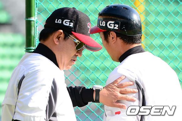 17일 오후 잠실구장에서 열린 '2013 한국야쿠르트 세븐 프로야구' LG 트윈스와 두산 베어스의 플레이오프 2차전, 경기에 앞서 LG 조계현 코치가 이병규와 이야기를 나누고 있다.