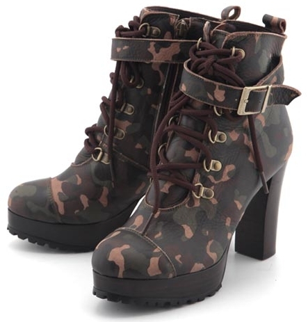 여성화 브랜드 '메일리엠'은 앵클부츠에 카모플라주 패턴을 적용해 더욱 액티브한 느낌을 배가시켰다. 앵클부츠는 11cm의 킬힐에 발목까지 신발끈을 조일 수 있어 하체가 부각되는 스키니진을 함께 착용한다면 섹시하면서 보이시한 느낌을 동시에 표출할 수 있는 것이 특징이다.
