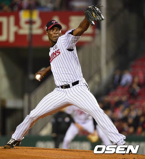 17일 오후 잠실구장에서 열린 '2013 한국야쿠르트 세븐 프로야구' LG 트윈스와 두산 베어스의 플레이오프 2차전, LG 선발투수 리즈가 힘차게 공을 뿌리고 있다.