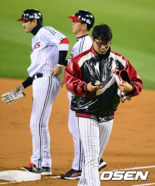 17일 오후 잠실구장에서 열린 '2013 한국야쿠르트 세븐 프로야구' LG 트윈스와 두산 베어스의 플레이오프 2차전, 1회말 무사에서 LG 박용택이 좌전 안타로 출루하자 류제국이 보호장비를 건네 받아 더그아웃으로 향하고 있다.