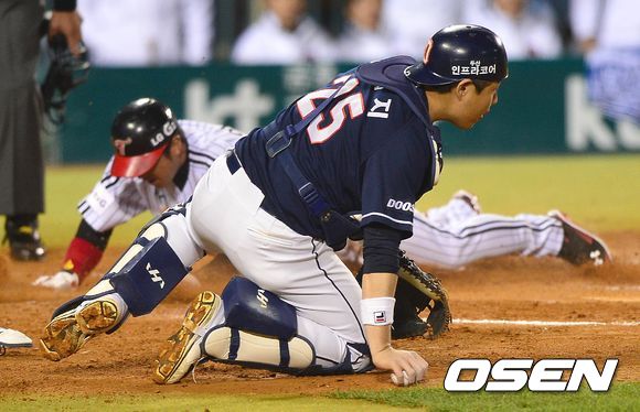 17일 오후 잠실구장에서 열린 '2013 한국야쿠르트 세븐 프로야구' LG 트윈스와 두산 베어스의 플레이오프 2차전, 2회말 LG 공격 1사 2, 3루 상황 9번 윤요섭의 선제 1타점 우익수 희생플라이 때 3루주자 이병규가 태그업해 홈에 세이프 되고 있다. 빗나간 송구에 아쉬워하는 두산 포수 양의지.