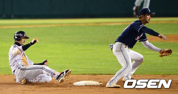 17일 오후 잠실구장에서 열린 '2013 한국야쿠르트 세븐 프로야구' LG 트윈스와 두산 베어스의 플레이오프 2차전, 1회말 2사 3루에서 LG 박용택이 좌전 적시타를 치고 2루로 쇄도하고 있다.