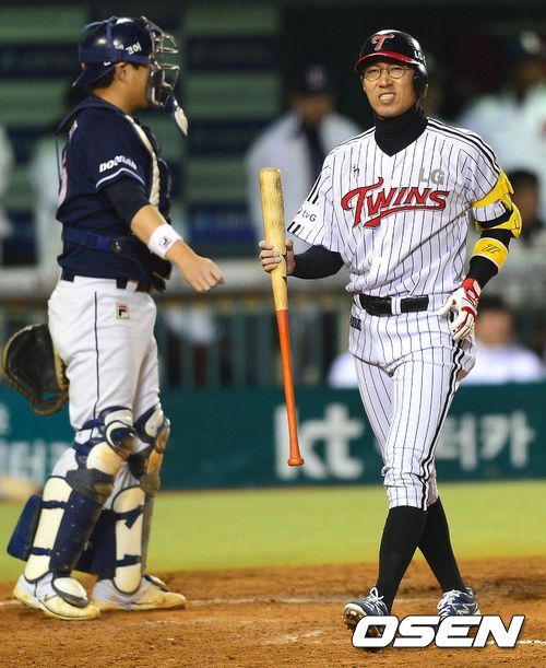 17일 오후 잠실구장에서 열린 '2013 한국야쿠르트 세븐 프로야구' LG 트윈스와 두산 베어스의 플레이오프 2차전, 3회말 LG공격 1사 주자없는 상황 4번 정성훈이 헛스윙 삼진을 당한 뒤 아쉬워하며 더그아웃으로 들어오고 있다.