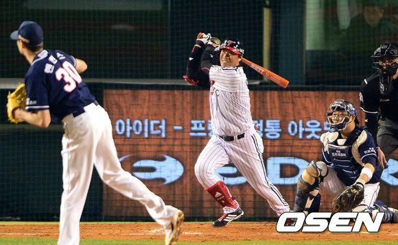 17일 오후 잠실구장에서 열린 '2013 한국야쿠르트 세븐 프로야구' LG 트윈스와 두산 베어스의 플레이오프 2차전, 3회말 2사에서 LG 이병규가 우전 안타를 날리고 있다.