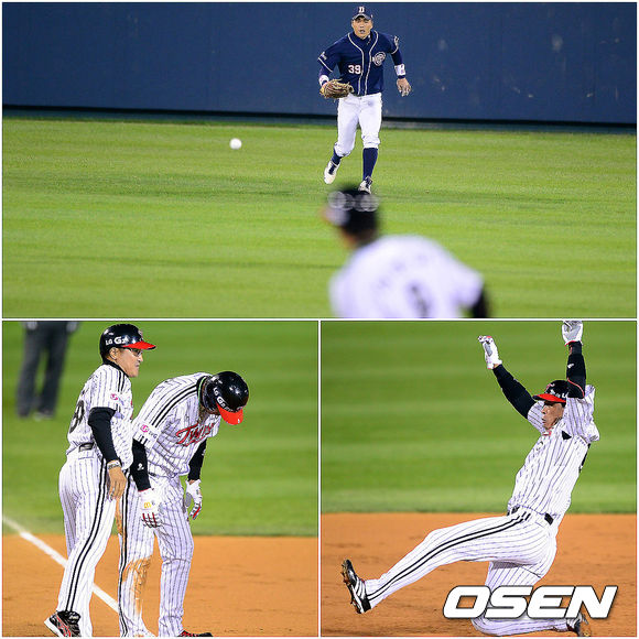 17일 오후 잠실구장에서 열린 '2013 한국야쿠르트 세븐 프로야구' LG 트윈스와 두산 베어스의 플레이오프 2차전, 3회말 2사 1루에서 LG 이병규가 이병규(7)의 중전안타에 두산 이종욱의 수비를 바라보며 2루에서 잠시 멈췄다가 3루까지 달려 세이프되고 있다.