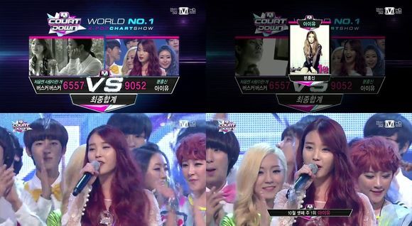 아이유는 17일 오후 방송된 엠넷 '엠카운트다운'에서 타이틀곡 '분홍신'으로 버스커버스커의 '처음엔 사랑이란게'를 제치고 1위를 차지했다.