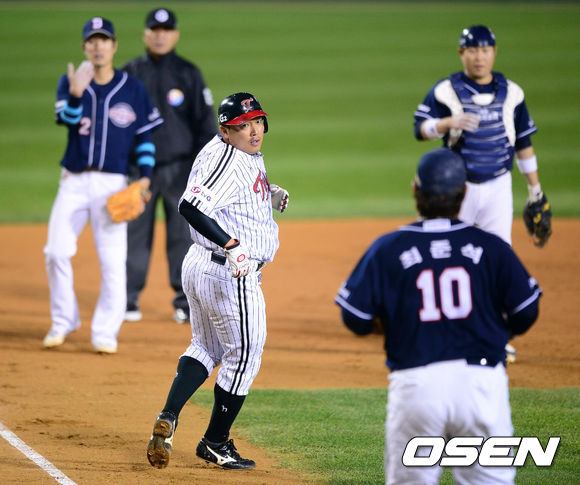 17일 오후 잠실구장에서 열린 '2013 한국야쿠르트 세븐 프로야구' LG 트윈스와 두산 베어스의 플레이오프 2차전, 4회말 1사 2,3루에서 LG 3루주자 윤요섭이 이진영의 1루땅볼에 협살에 걸려 태그를 당하고 있다.