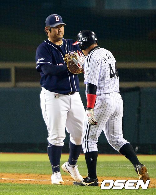 17일 오후 잠실구장에서 열린 '2013 한국야쿠르트 세븐 프로야구' LG 트윈스와 두산 베어스의 플레이오프 2차전, 4회말 1사 2,3루에서 LG 이진영의 내야땅볼 때 런다운에 걸린 3루주자 윤요섭이 두산 최준석에 태그아웃되고 있다.