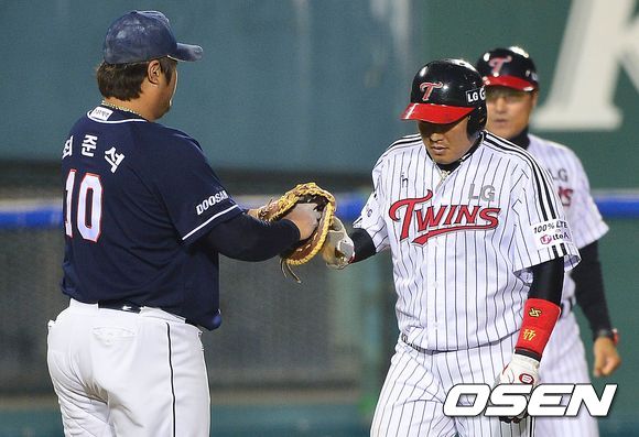 17일 오후 잠실구장에서 열린 '2013 한국야쿠르트 세븐 프로야구' LG 트윈스와 두산 베어스의 플레이오프 2차전, 4회말 LG공격 1사 2, 3루 상황 3번 이진영의 1루수 앞 땅볼 때 런다운에 걸린 3루 주자 윤요섭이 태그 상황이 오자 직접 글러브를 터치하고 있다.