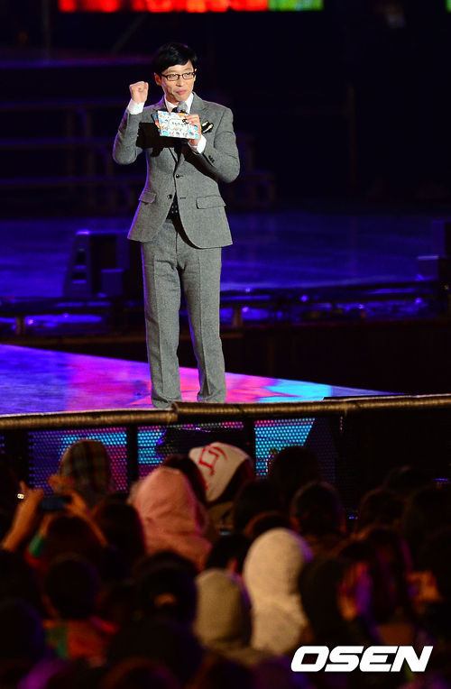유재석이 가요제를 찾은 팬들에게 인사를 하고 있다.