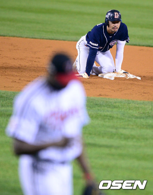 17일 오후 잠실구장에서 열린 '2013 한국야쿠르트 세븐 프로야구' LG 트윈스와 두산 베어스의 플레이오프 2차전, 5회초 1사 1,2루에서 두산 오재원이 양의지의 유격수 땅볼에 포스아웃당하고 병살로 이닝이 종료되자 아쉬워하고 있다.