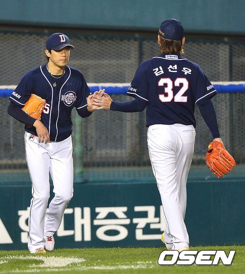 17일 오후 잠실구장에서 열린 '2013 한국야쿠르트 세븐 프로야구' LG 트윈스와 두산 베어스의 플레이오프 2차전, 5회말 LG공격 2사 1, 2루 상황 두산 투수 김선우가 마운드를 내려가며 교체되는 오현택과 인사를 나누고 있다.