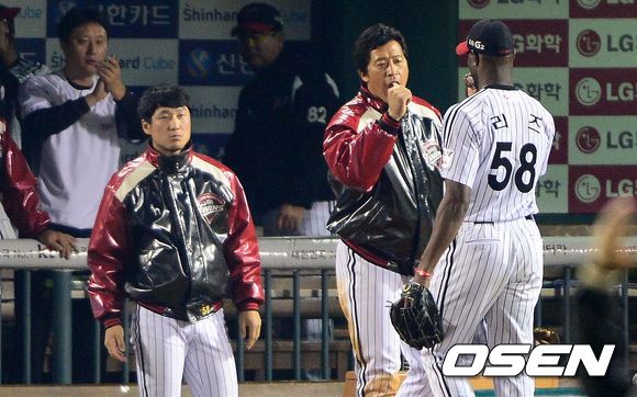 17일 오후 잠실구장에서 열린 '2013 한국야쿠르트 세븐 프로야구' LG 트윈스와 두산 베어스의 플레이오프 2차전, 6회초 2사에서 LG 리즈가 두산 정수빈을 삼진으로 처리하고 덕아웃으로 가며 이병규와 하이파이브를 하고 있다.